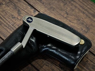 Headcover: 重厚なブラックレザーに真鍮製のロゴボタンが光る専用パターカバー。バッグから取り出すその瞬間から、プレミアムな体験が始まります。