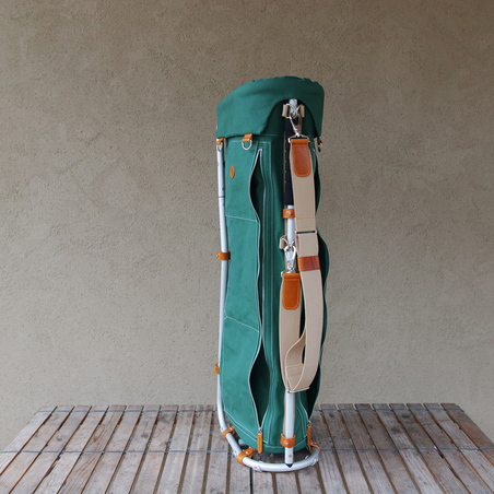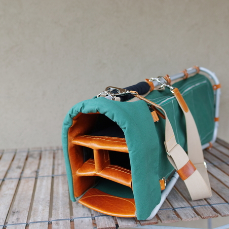 NEWアルミフレームカートバッグには、随所に分厚いベジタブルタンニンレザーが使われています。