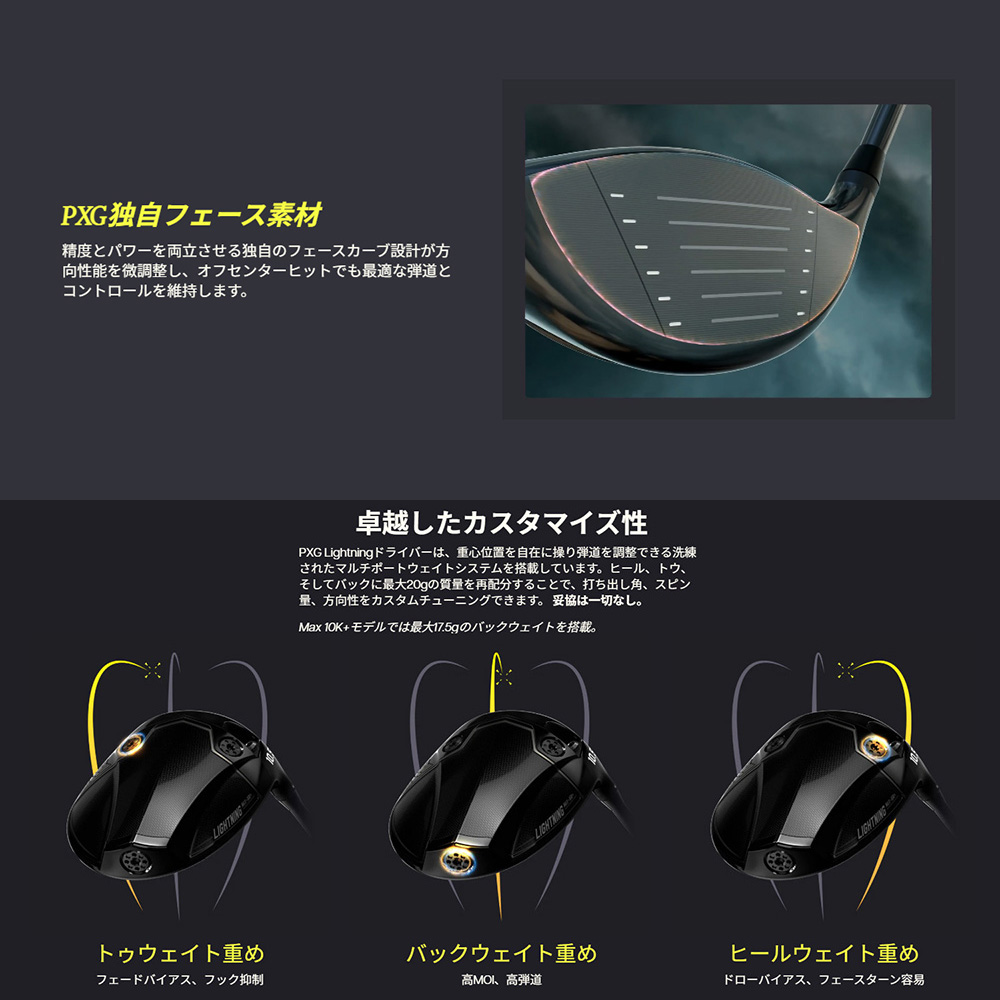 PXG Lightning ドライバーは、ボールに力が伝わる瞬間をしっかり捉え、これまで以上に速く、安定した弾道へ導いてくれます。精密に設計された全モデルには、PXG独自の新開発チューンドフェースを搭載。振動とインパクトを同期させ、エネルギー伝達を最大化し、爆発的な飛距離、そしてPXG特有の打音と打感を生み出します。