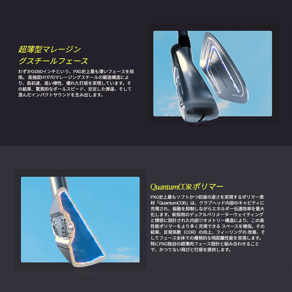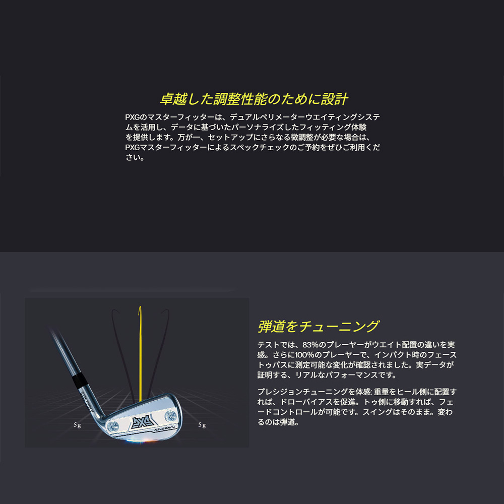 優れたパフォーマンスと精密なフィッティングのために設計された PXG 0311 GEN8 アイアン。USGA規定内で許される最大のC.O.R.を実現し、ゴルフクラブにおける究極のカスタマイズ性能を提供します。革新的なデュアルペリメーターウエイティングシステムにより、PXGのマスターフィッターは、設計通りのソール形状と最適なターフインタラクションを維持したまま、弾道やショット形状を緻密に調整することが可能です。
