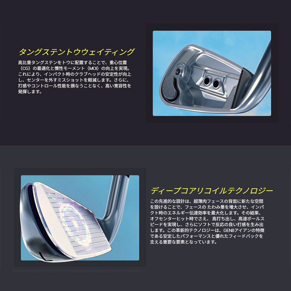 優れたパフォーマンスと精密なフィッティングのために設計された PXG 0311 GEN8 アイアン。USGA規定内で許される最大のC.O.R.を実現し、ゴルフクラブにおける究極のカスタマイズ性能を提供します。革新的なデュアルペリメーターウエイティングシステムにより、PXGのマスターフィッターは、設計通りのソール形状と最適なターフインタラクションを維持したまま、弾道やショット形状を緻密に調整することが可能です。