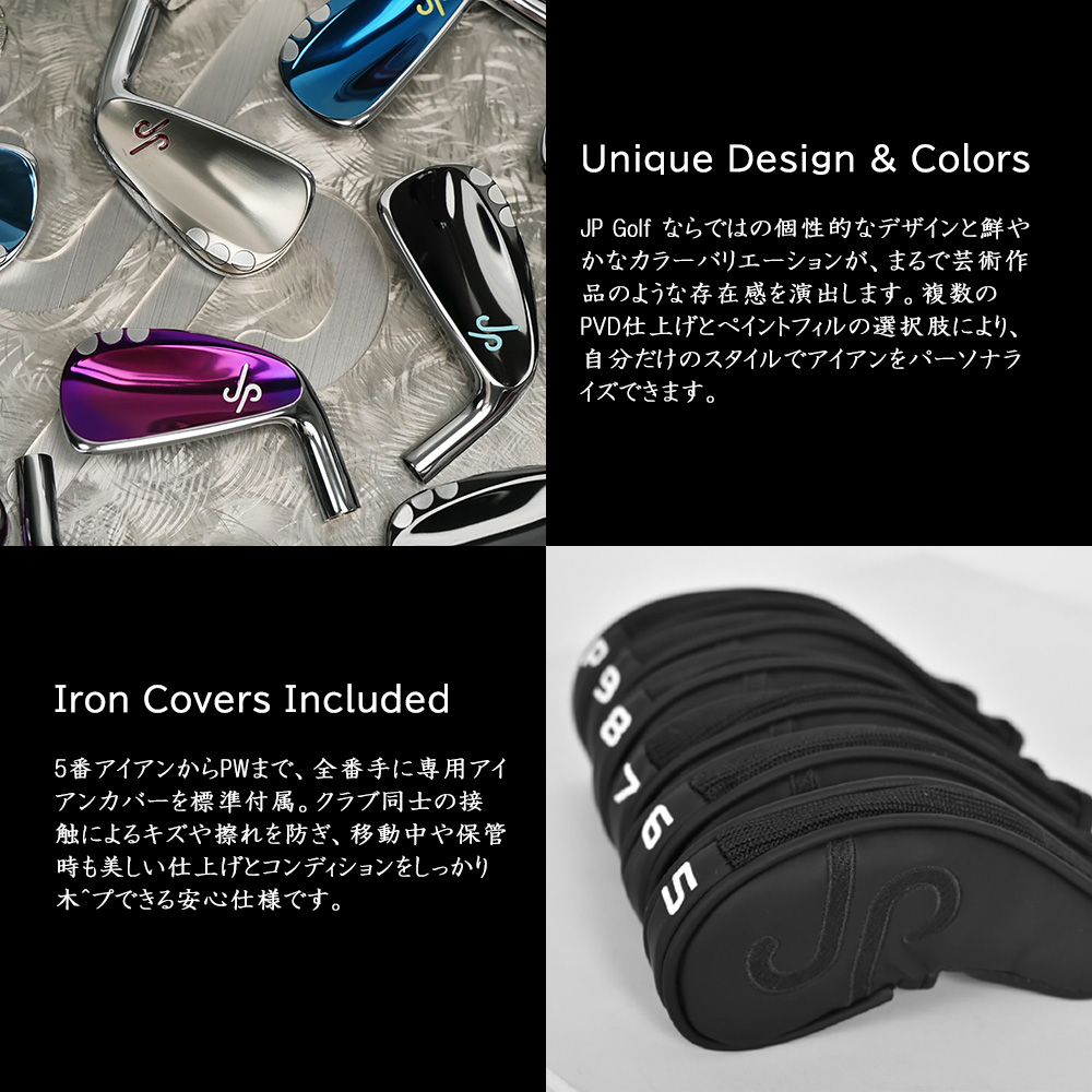 JP GOLF のキャンバーソール、独自のアーチ形状ヘッドデザイン、そして芸術的な仕上げを備えた、鍛造・削り出し製法で美しく仕上げられたアイアンは、精密さ、安定感、操作性――そのすべてを高次元で調和させた一本です。
