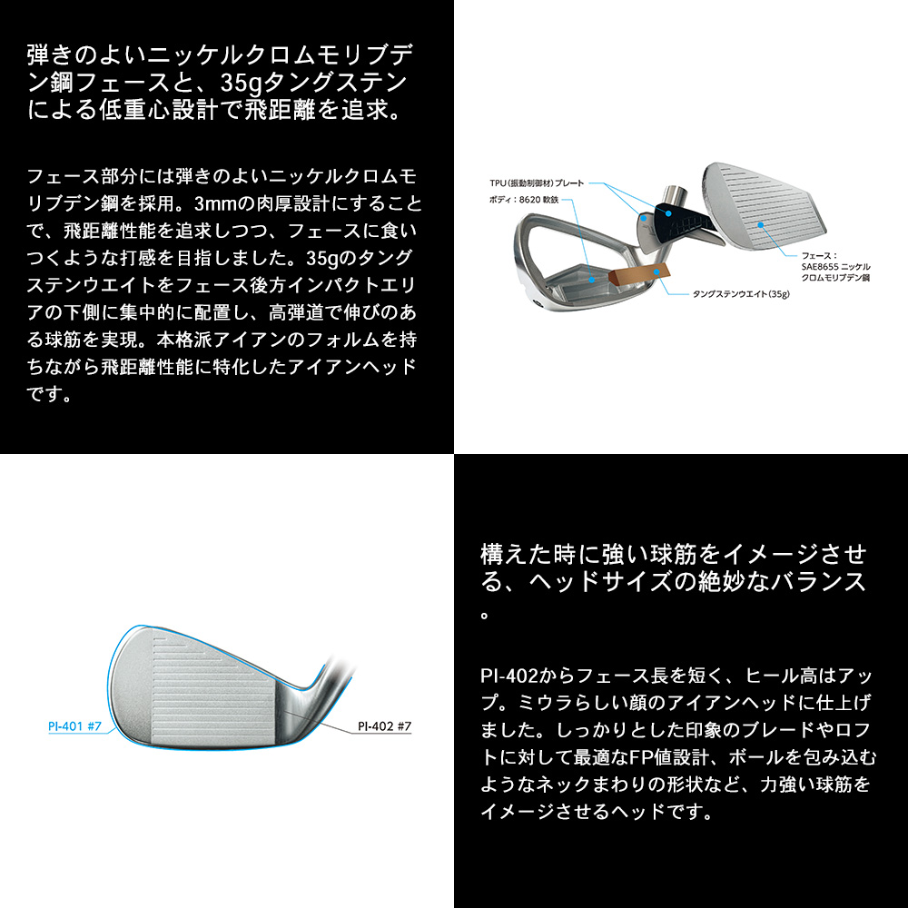 PI-402からフェース長を短く、ヒール高はアップ。ミウラらしい顔のアイアンヘッドに仕上げました。しっかりとした印象のブレードやロフトに対して最適なFP値設計、ボールを包み込むようなネックまわりの形状など、力強い球筋をイメージさせるヘッドです。