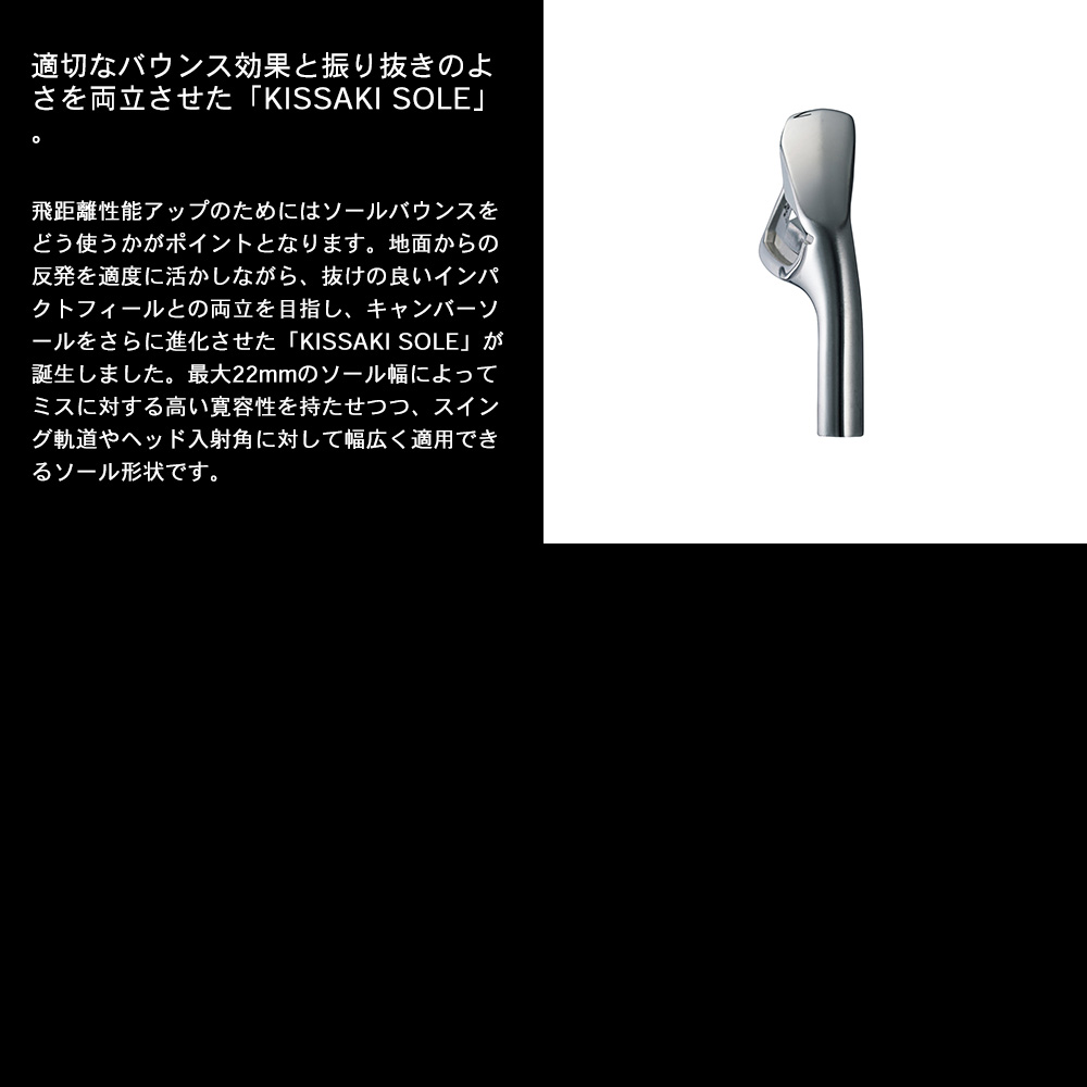 飛距離性能アップのためにはソールバウンスをどう使うかがポイントとなります。地面からの反発を適度に活かしながら、抜けの良いインパクトフィールとの両立を目指し、キャンバーソールをさらに進化させた「KISSAKI SOLE」が誕生しました。最大22mmのソール幅によってミスに対する高い寛容性を持たせつつ、スイング軌道やヘッド入射角に対して幅広く適用できるソール形状です。